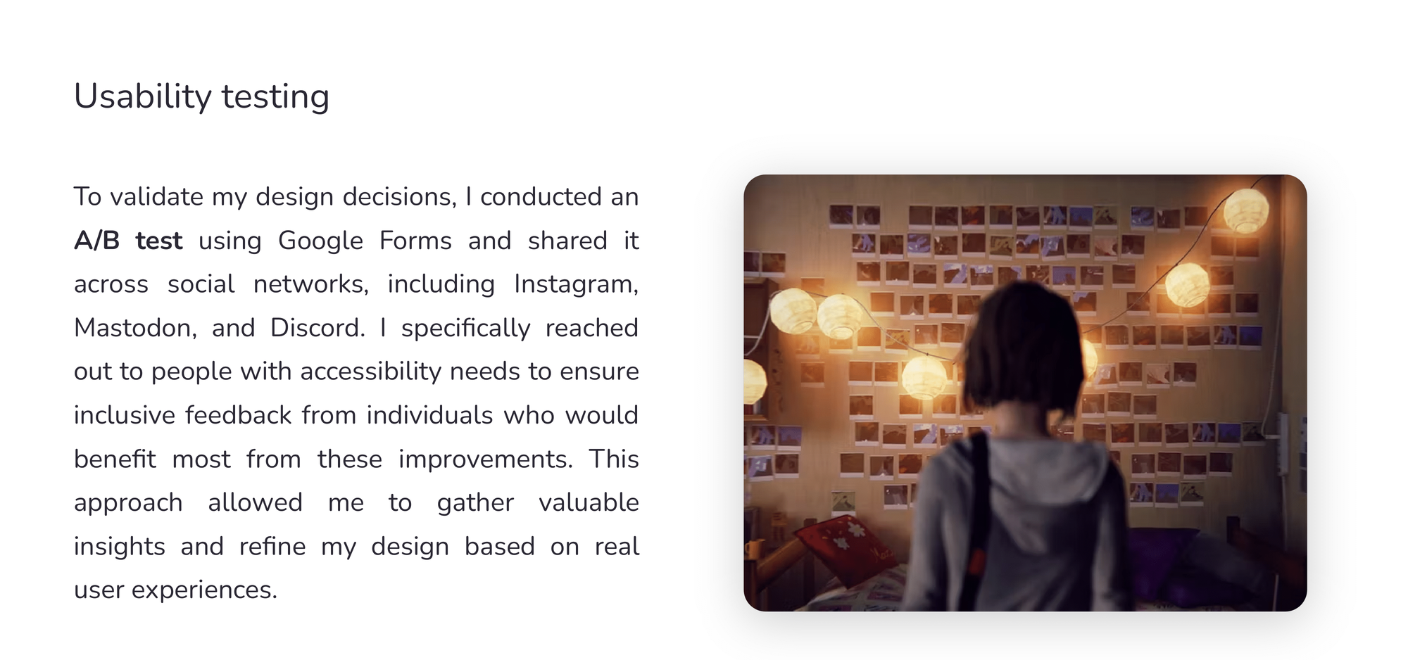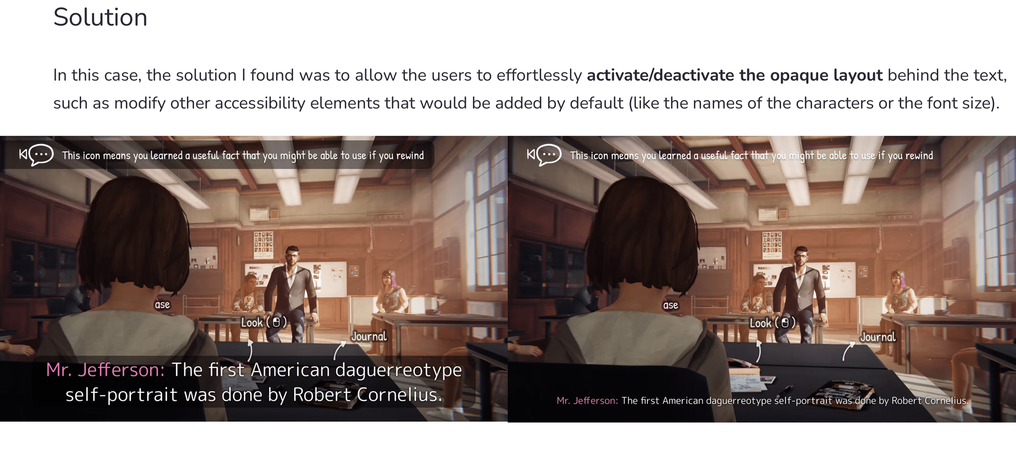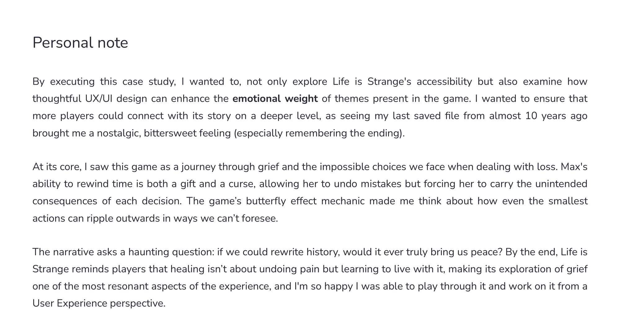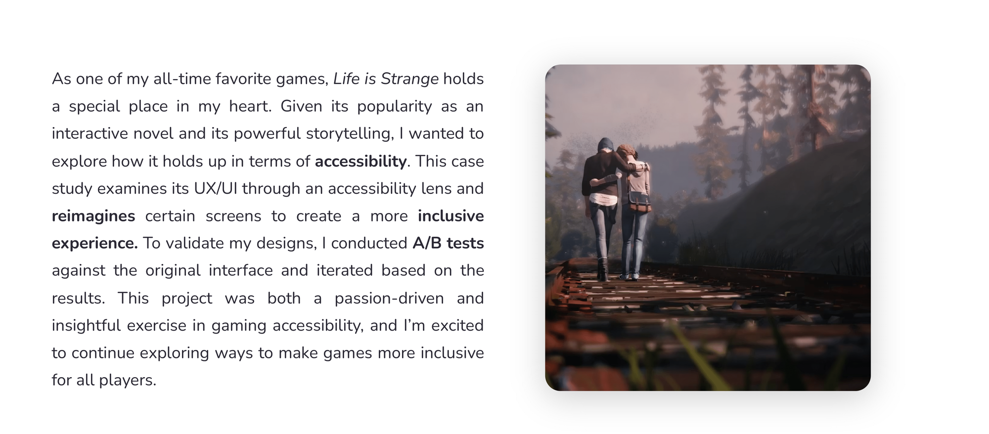 Explore my work and join me in shaping a Solarpunk future through design. Life is Strange - Accessibility Case Study 01 Mar 2025 3 min read GALLERY - Before & after screensThank you for scrolling! 🦋